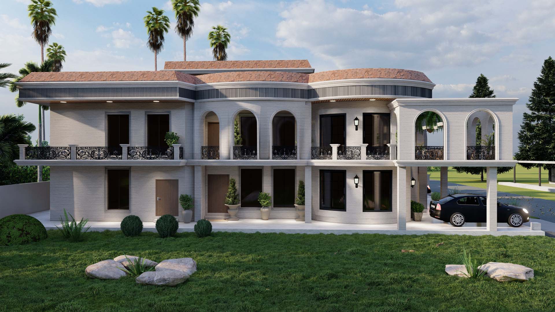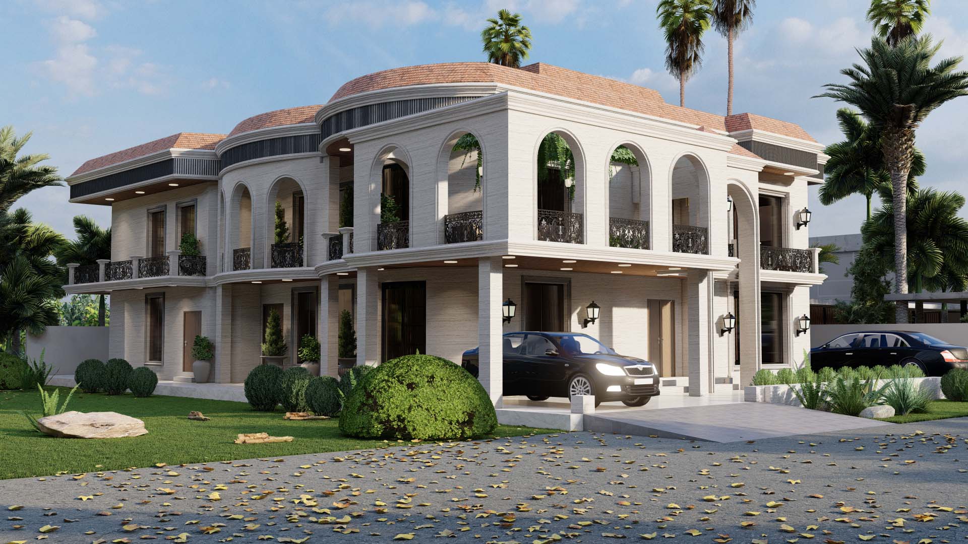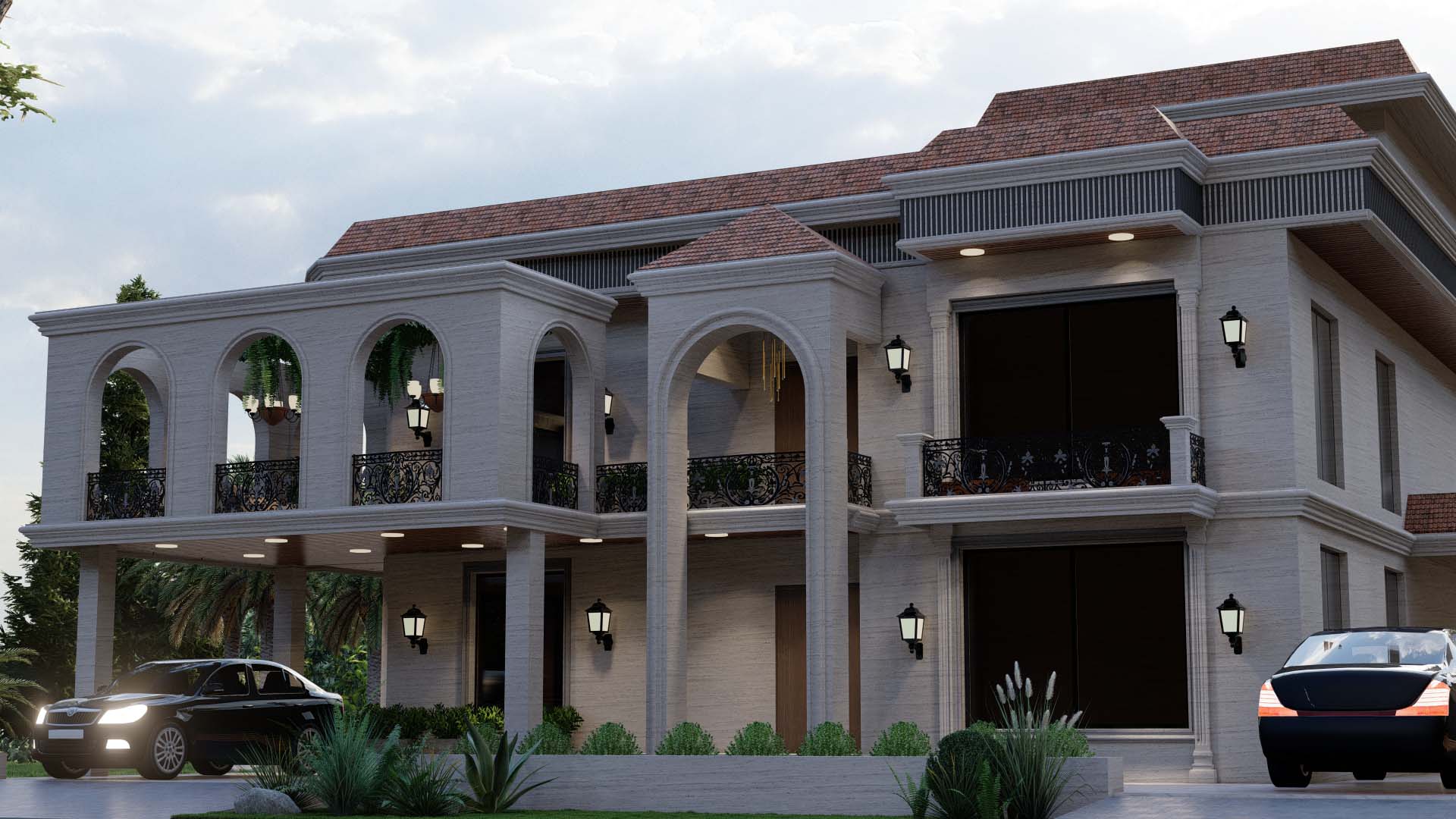 Casa Royale captures the essence of timeless elegance through its neoclassical-inspired architecture. The design features grand arched openings, intricate wrought-iron balconies, and soft-toned stone textures that reflect luxury and sophistication. The symmetrical façade, accentuated by classical columns and detailed cornices, gives the house a majestic presence while maintaining a sense of harmony and proportion. Warm lighting and lush greenery enhance the serene, inviting ambiance of the exterior. This residence blends traditional grandeur with modern functionality a perfect example of neoclassical architecture reimagined for contemporary living.