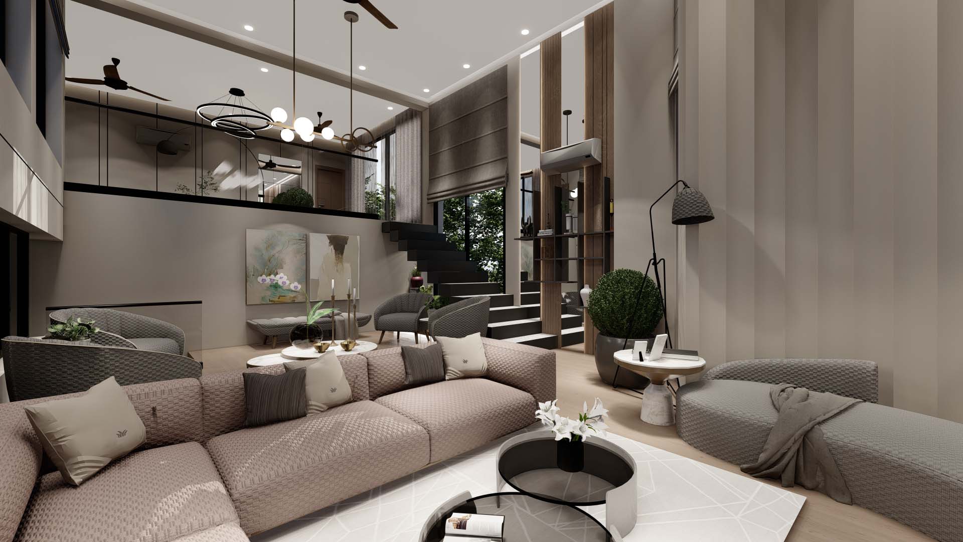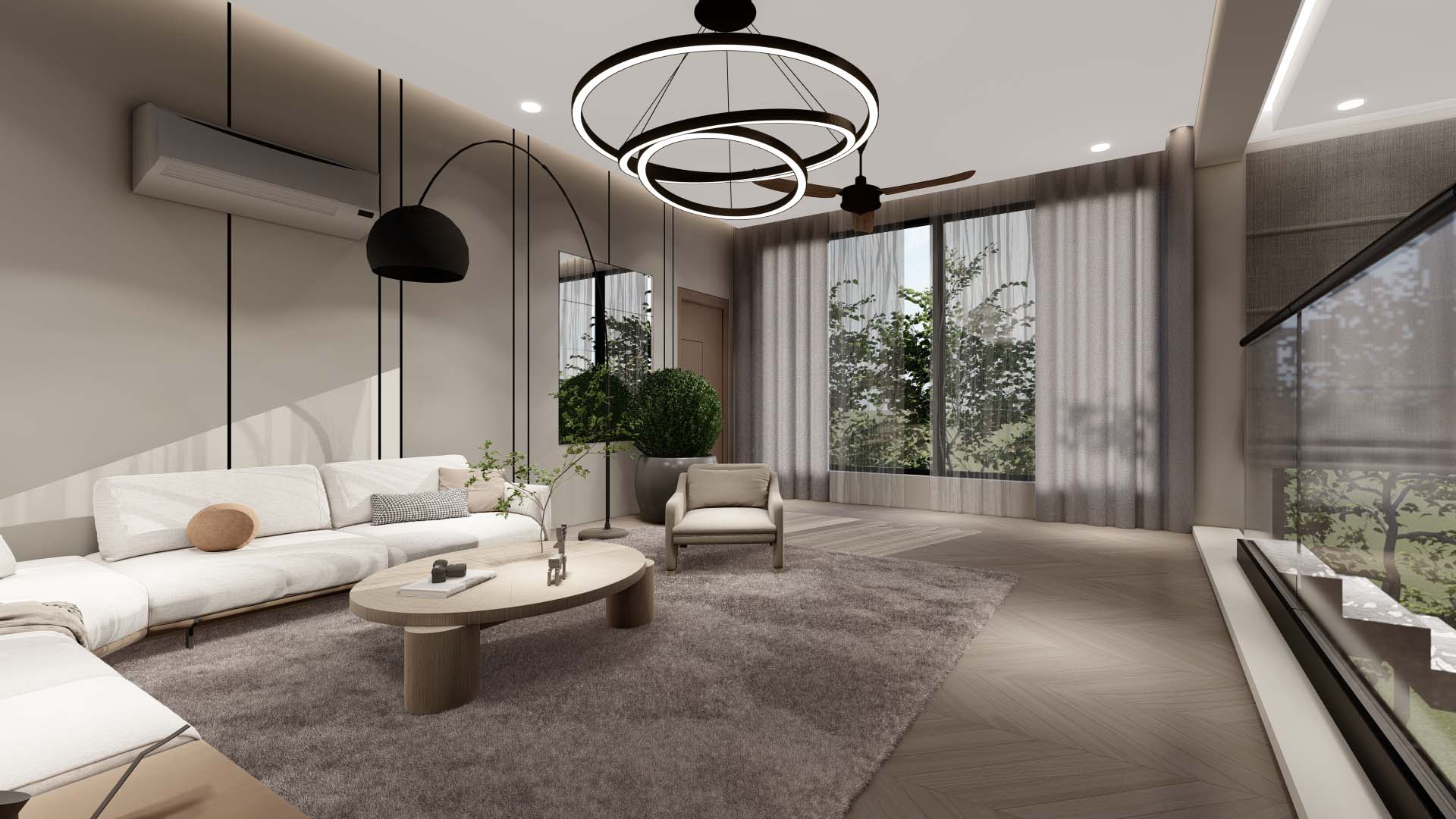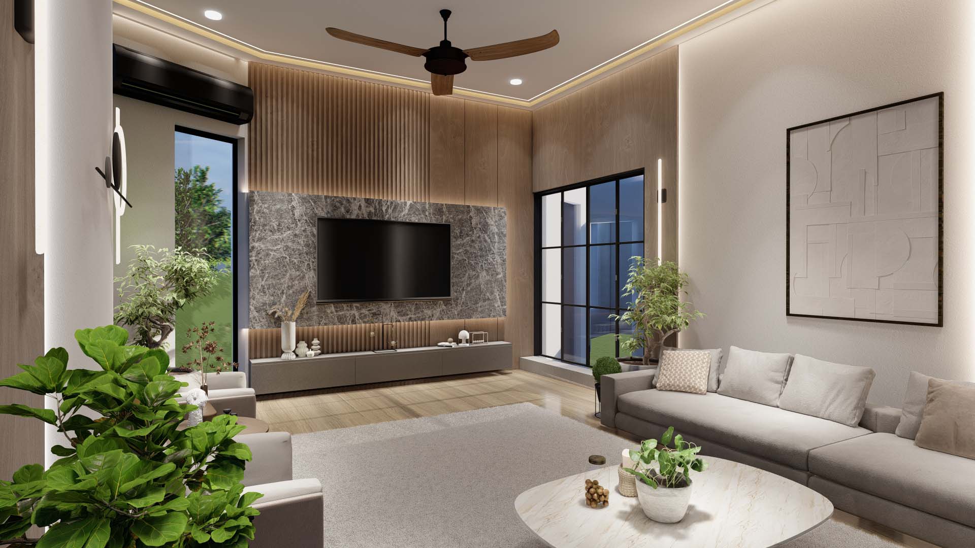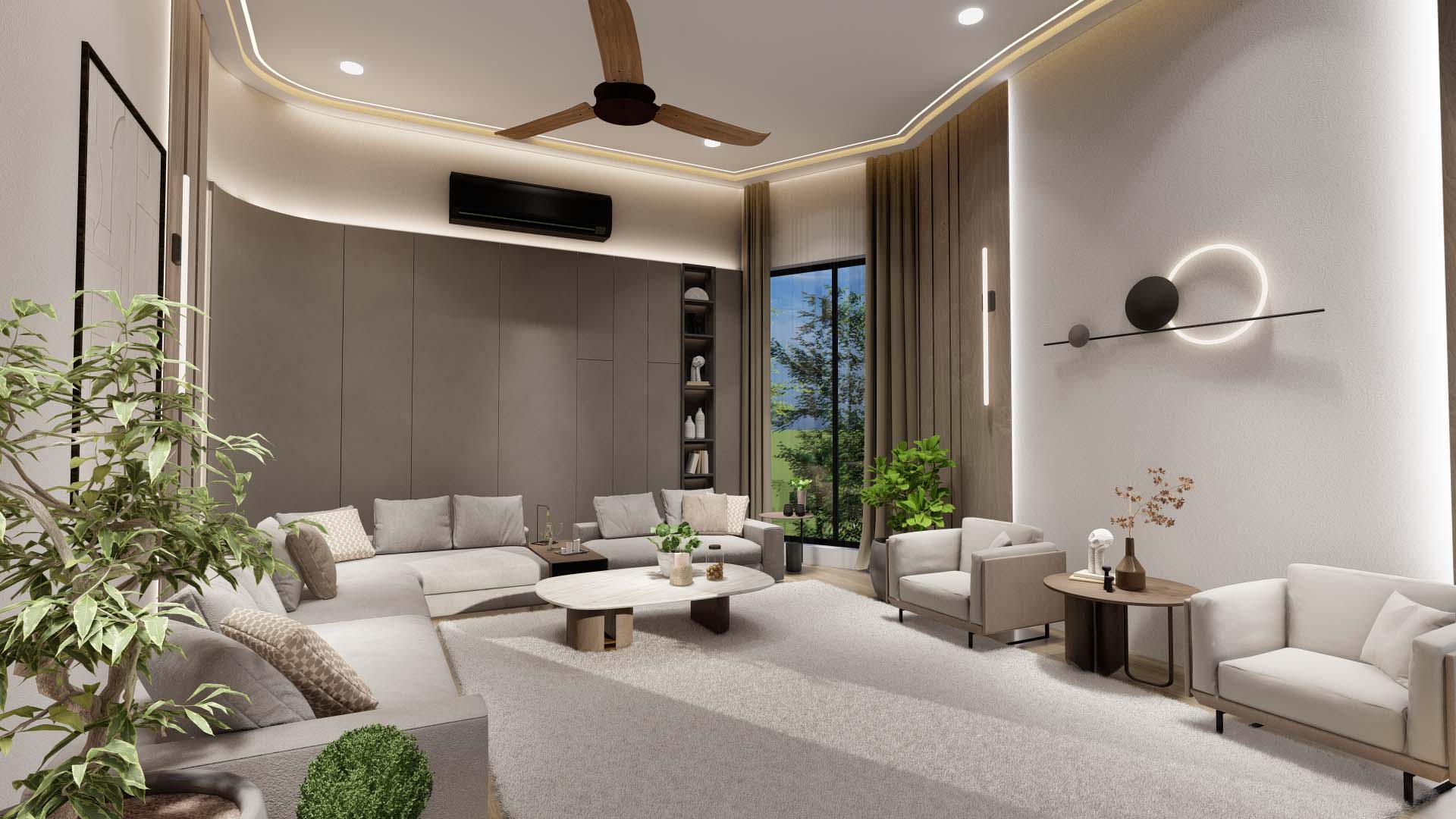 This 1 Kanal interior project features a modern minimalist living room with a soothing neutral palette of beige, grey, and warm wood textures. The blend of marble finishes, sleek lighting, and natural greenery brings elegance and calm to the space. With its refined details and open layout, it defines luxury contemporary living in Islamabad.