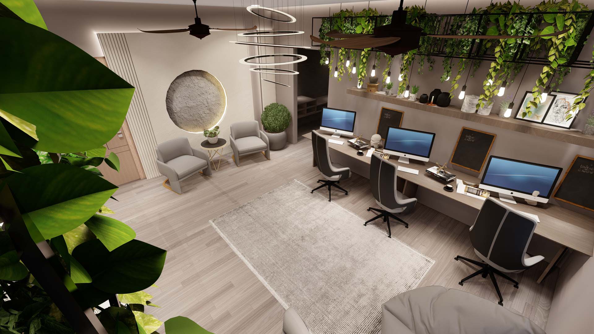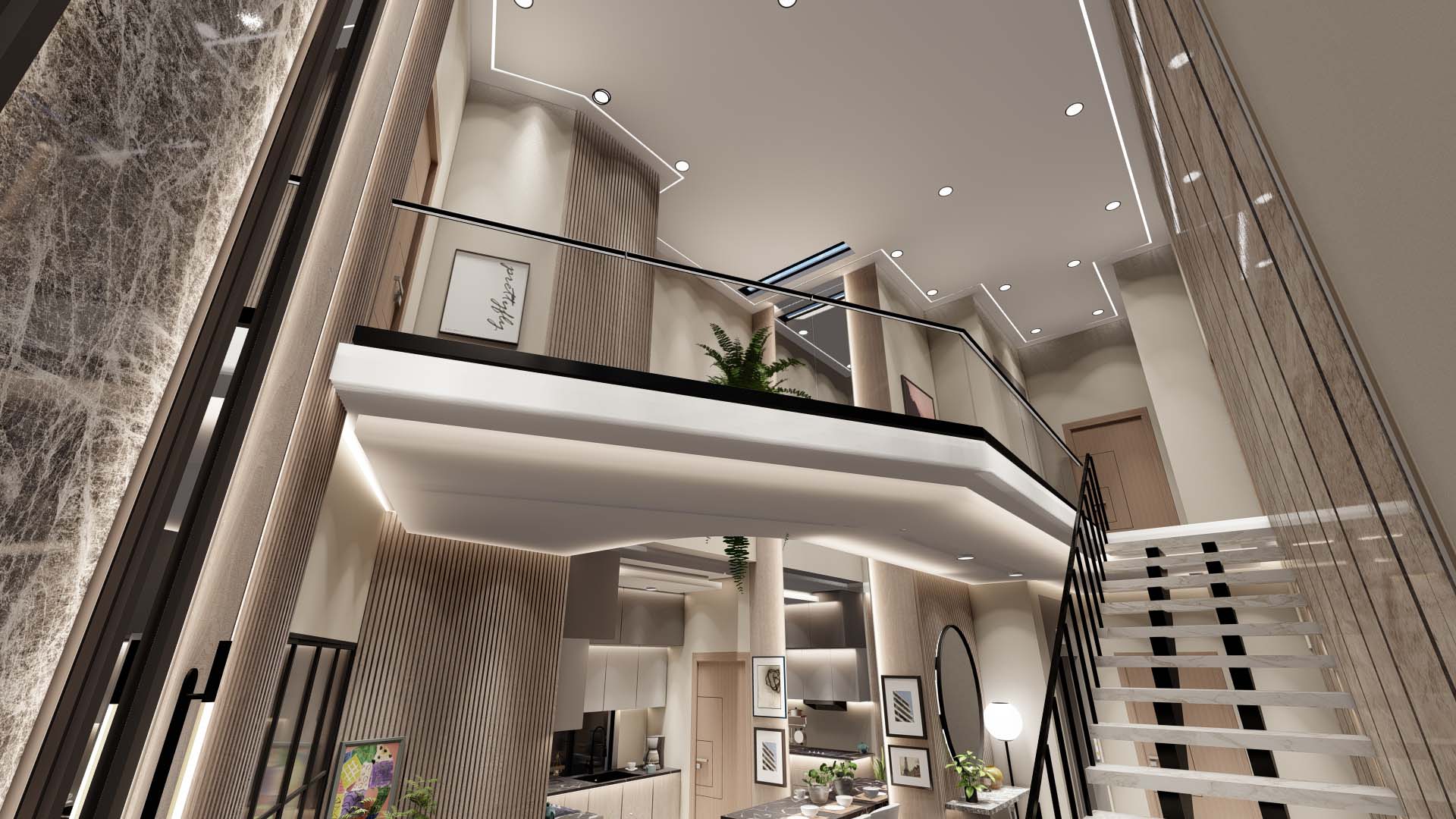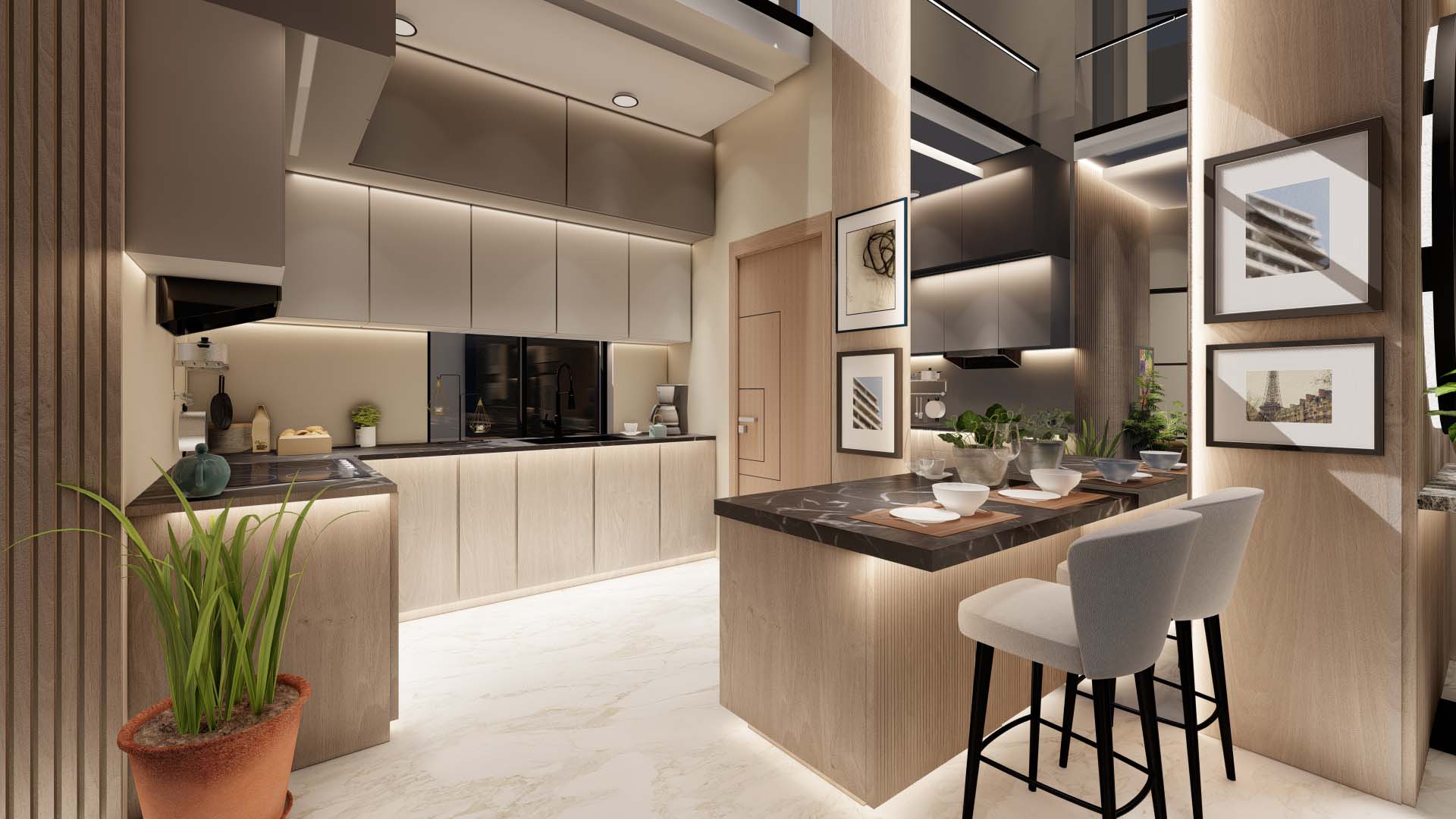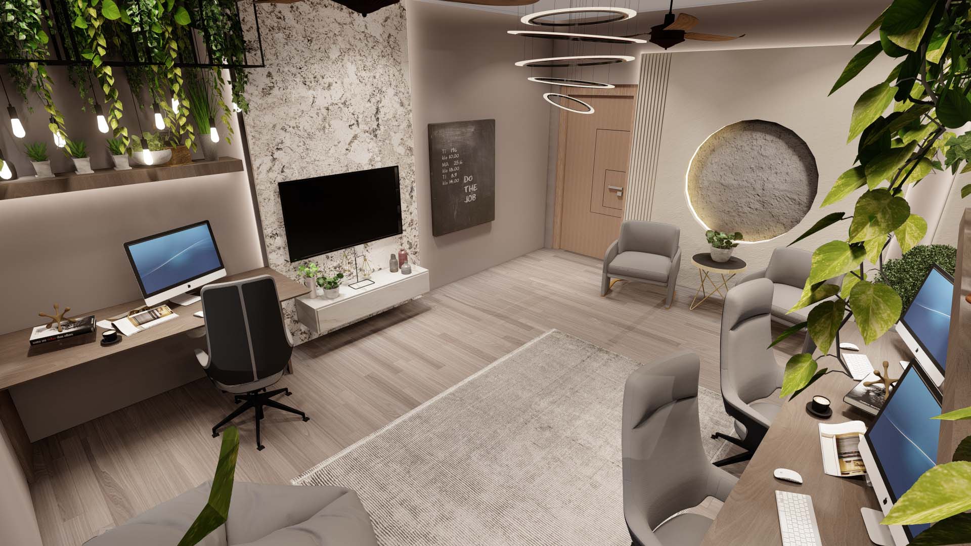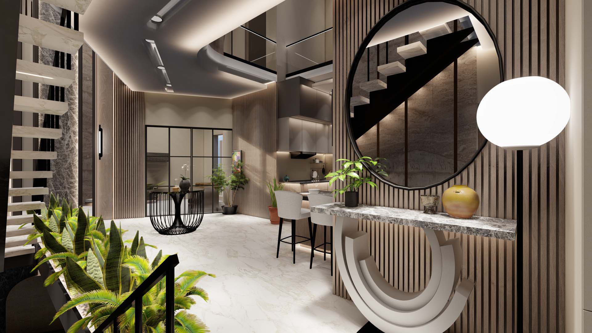 This 1 Kanal interior project features a modern minimalist living room with a soothing neutral palette of beige, grey, and warm wood textures. The blend of marble finishes, sleek lighting, and natural greenery brings elegance and calm to the space. With its refined details and open layout, it defines luxury contemporary living in Islamabad.
