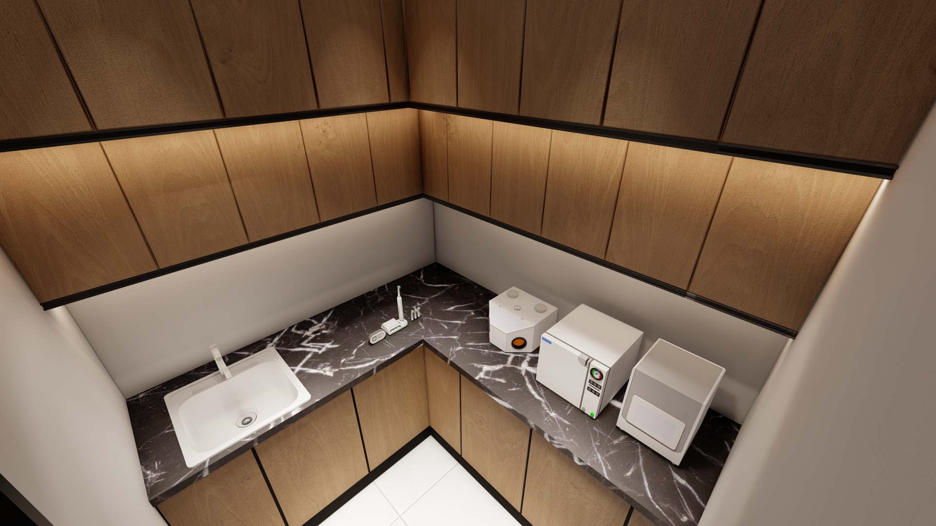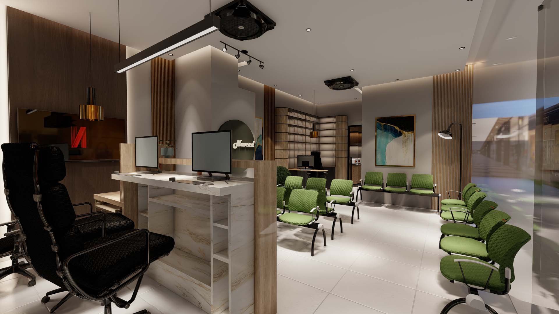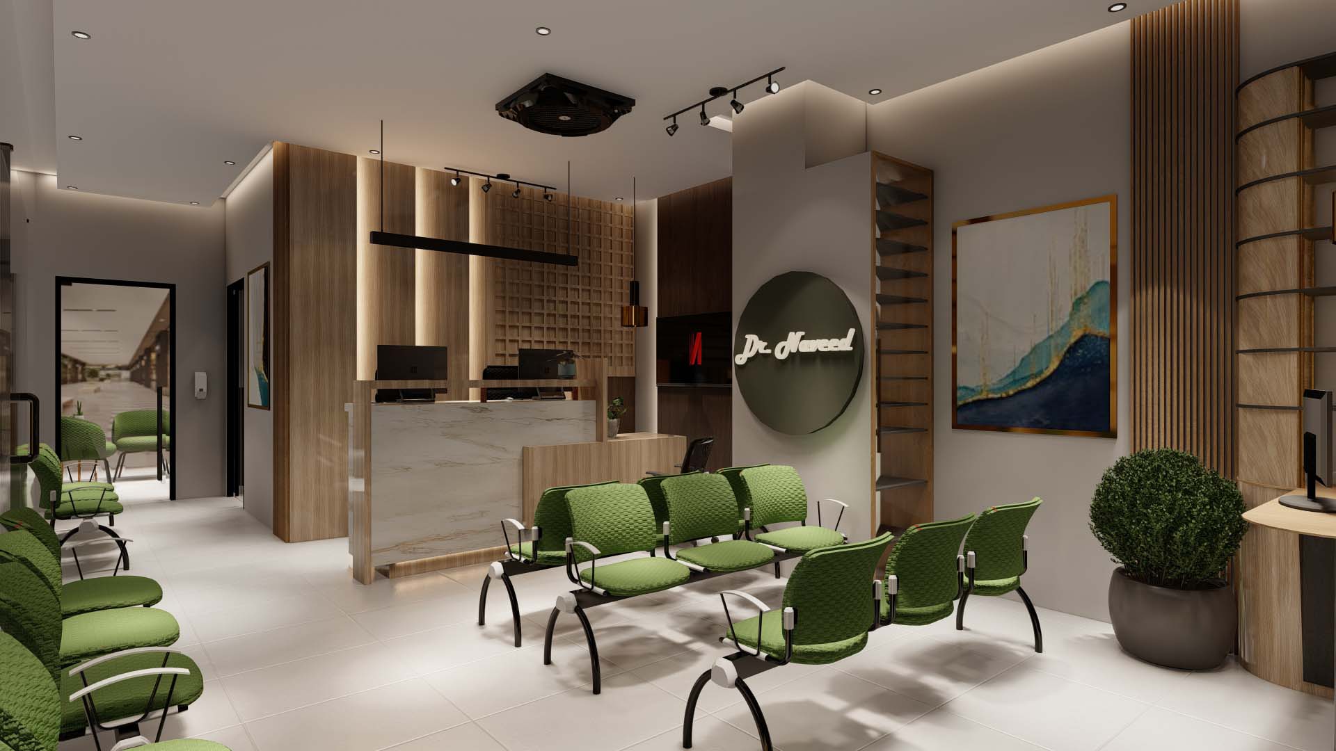This modern clinic interior combines comfort, elegance, and functionality. The neutral tones, natural wood textures, and fresh green seating create a calm and welcoming atmosphere for patients. Warm ambient lighting and minimalist décor enhance the sense of cleanliness and sophistication, while touches of art and greenery bring life to the space. The result is a biophilic, patient-friendly environment that promotes relaxation and trust.