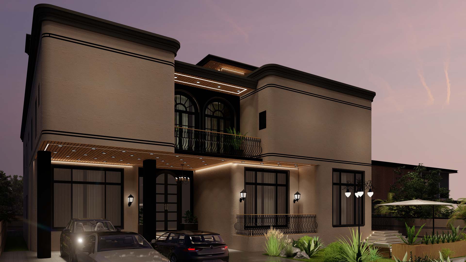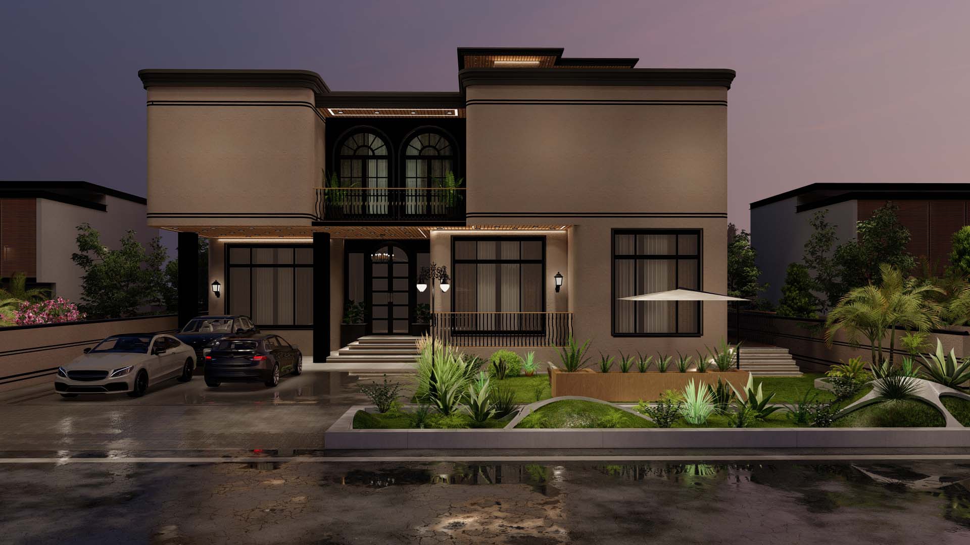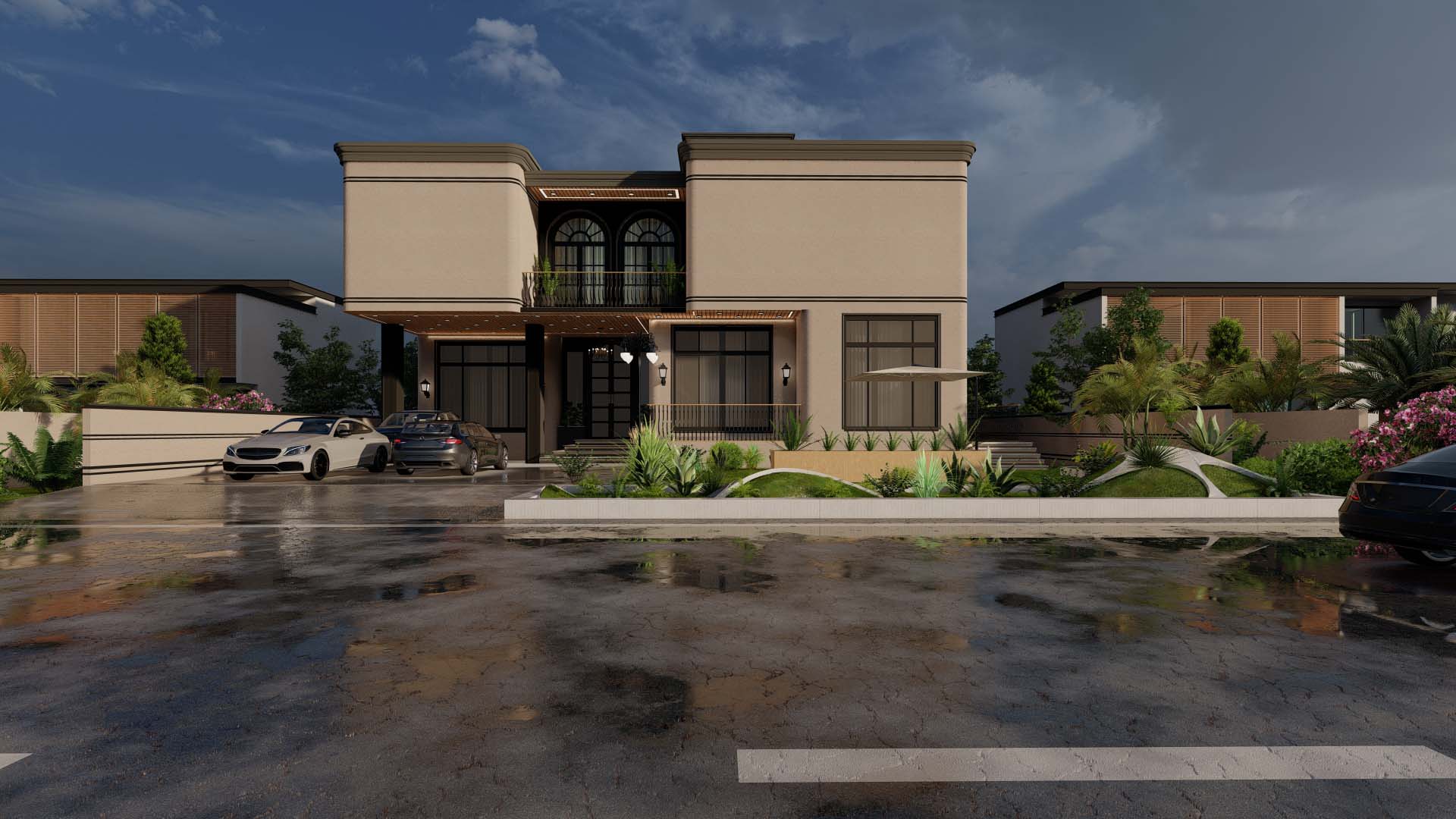 The Serenity Villa exemplifies a harmonious fusion of modern sophistication and timeless charm. The clean geometric lines and balanced symmetry create a sense of order and refinement, while the neutral façade with subtle black accents adds depth and character. The front elevation is highlighted by graceful arches and a delicately detailed balcony that softens the modern structure with a touch of classical elegance. The driveway and entrance are thoughtfully designed for functionality and grandeur, offering an inviting welcome. With its blend of luxury, simplicity, and nature, this residence is a true expression of contemporary architectural grace.