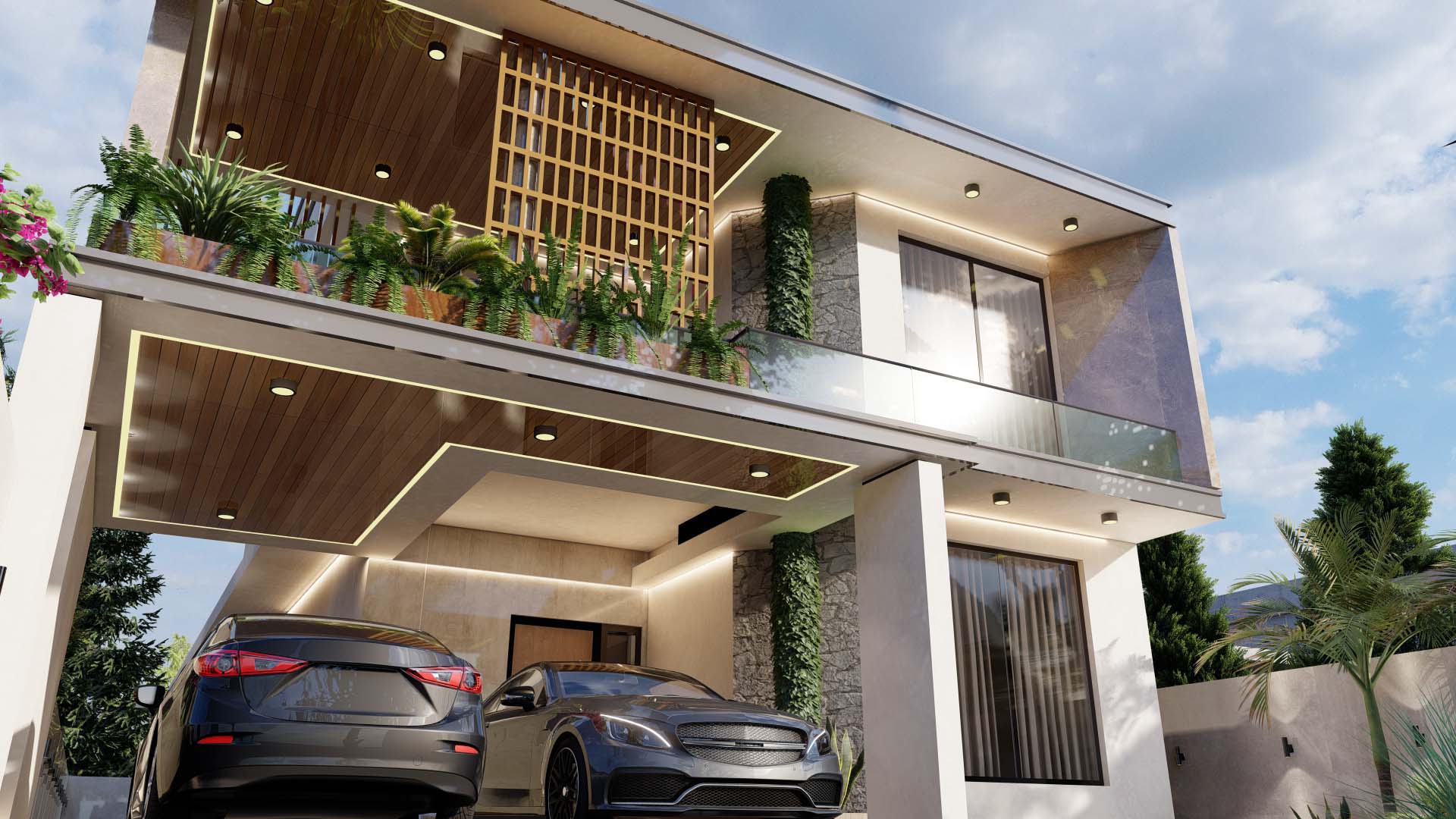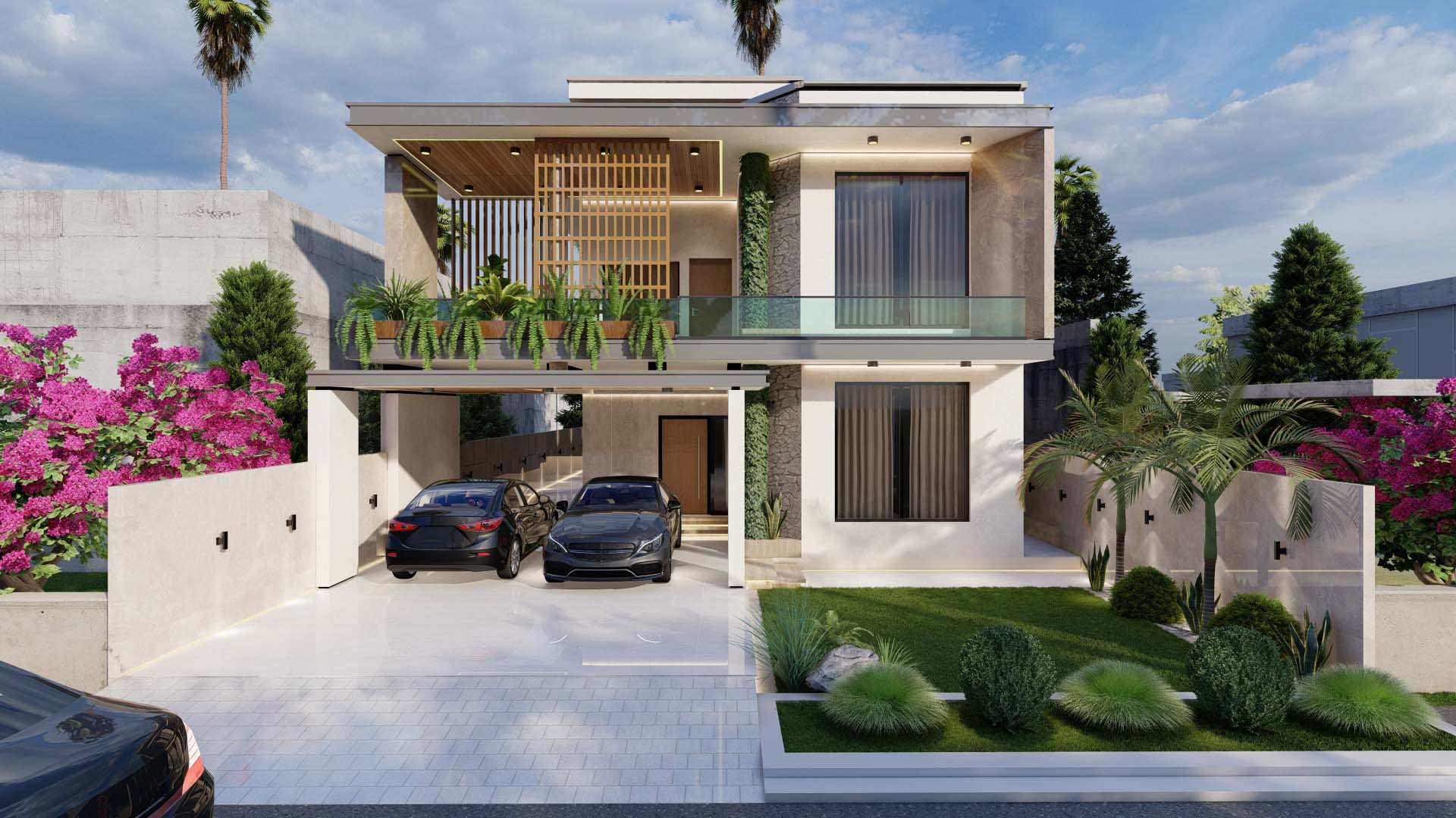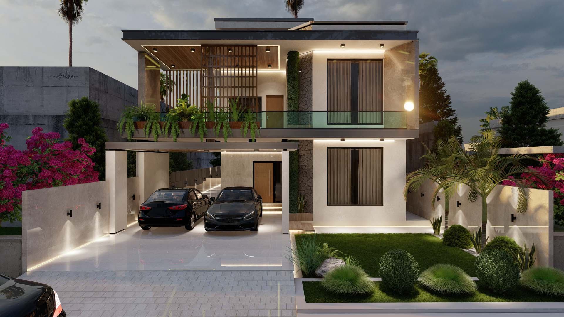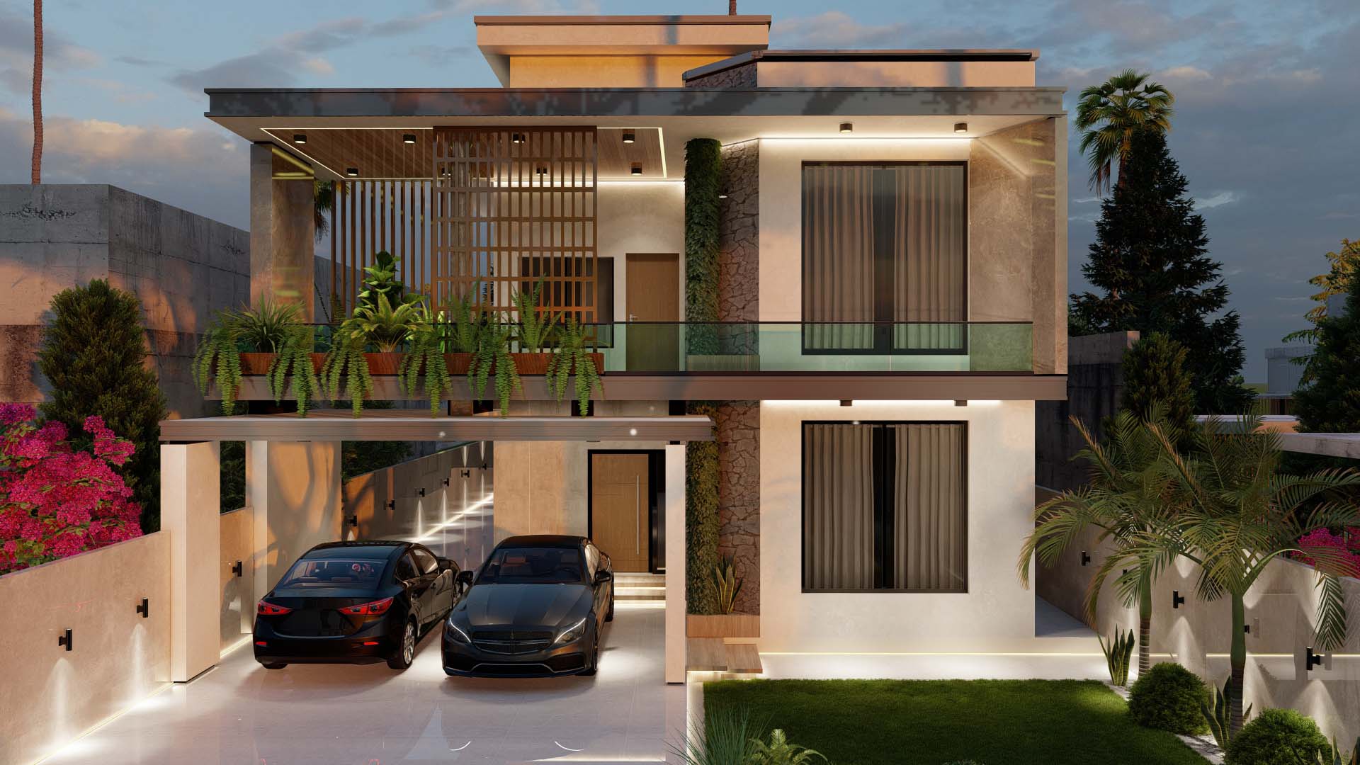 The Urban Oasis is a stunning modern house design in F-8 Islamabad, combining luxury, elegance, and contemporary style. The façade features warm stone textures, glass railings, and ambient LED lighting that highlight its refined architectural lines. Large windows and lush planters bring natural light and greenery into the living spaces, creating a perfect harmony between nature and modern design. With its spacious double garage, landscaped garden, and elegant upper terrace, this F-8 Islamabad modern residence offers the ultimate blend of comfort, functionality, and sophistication.