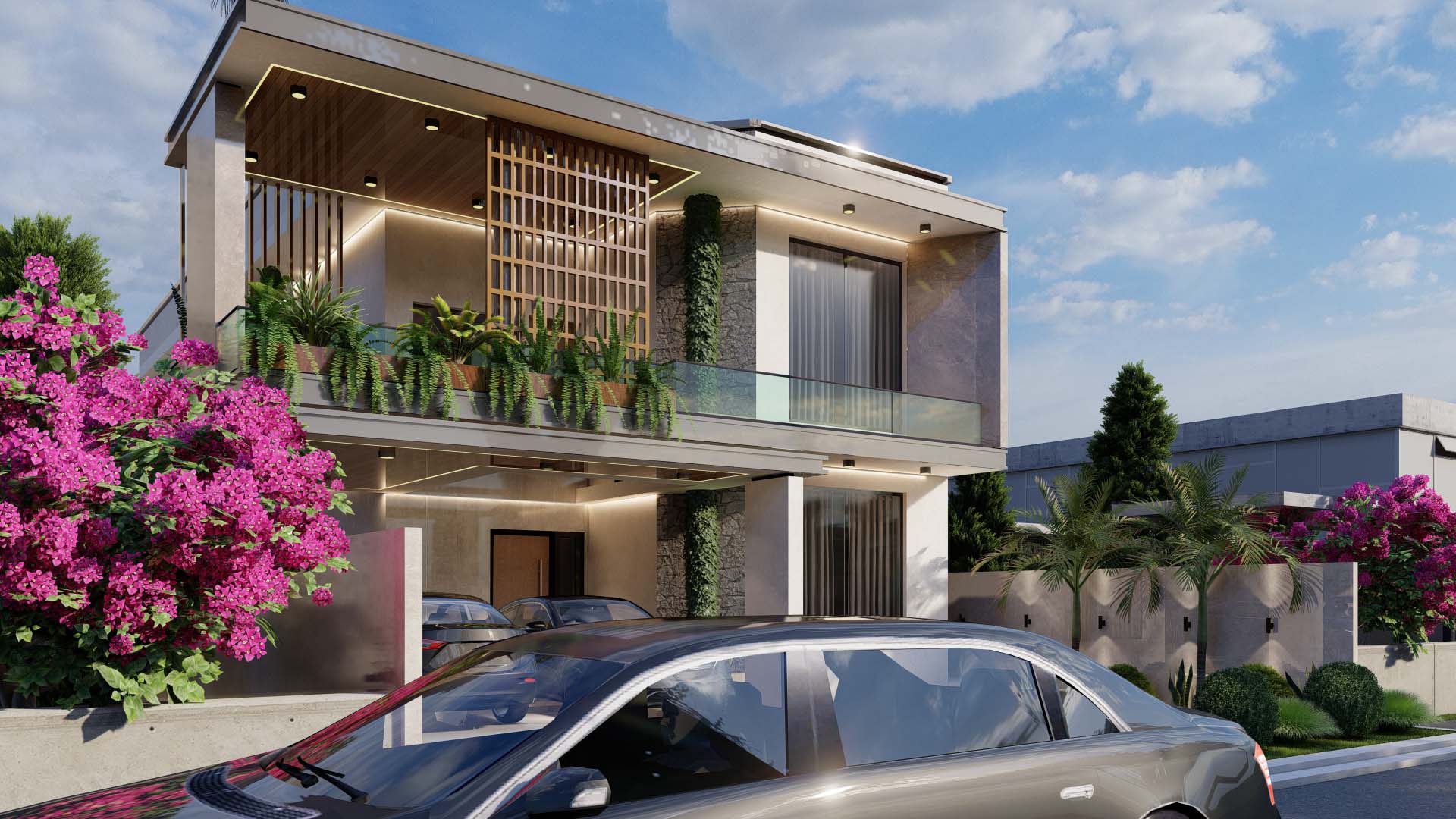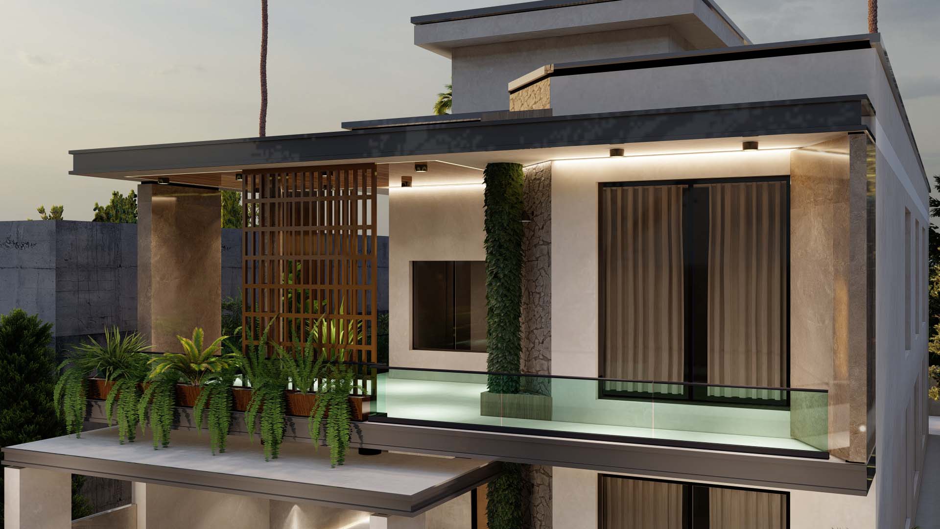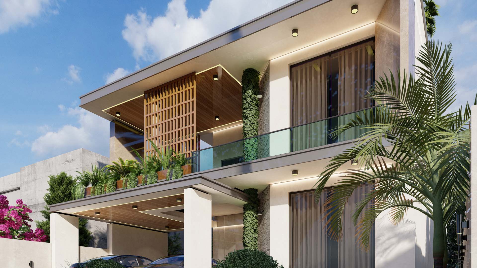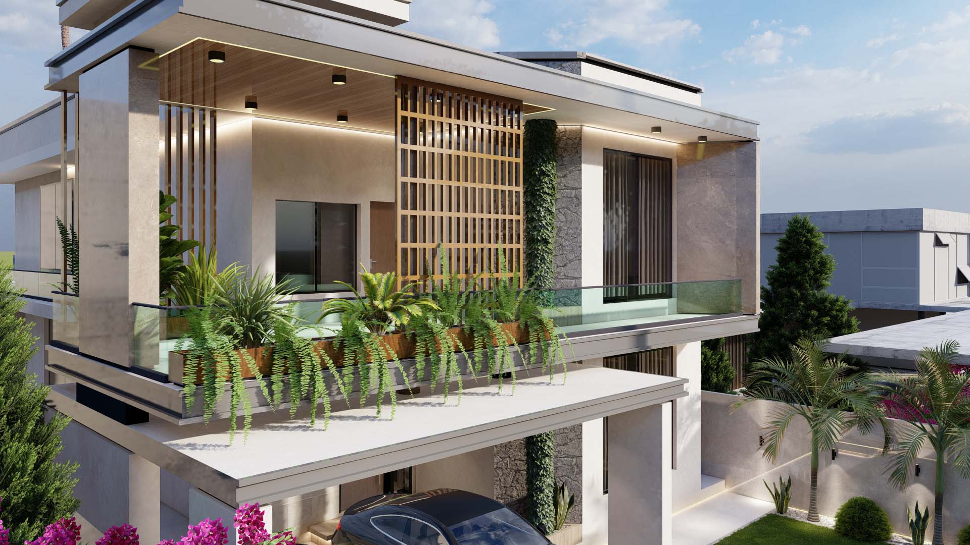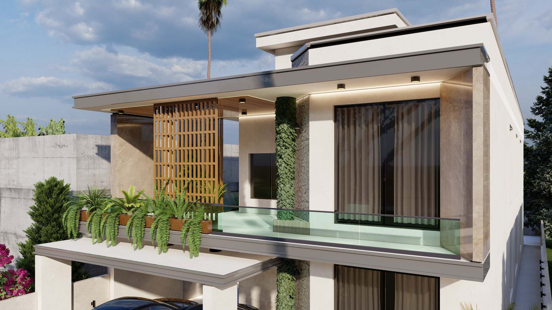 The Urban Oasis is a stunning modern house design in F-8 Islamabad, combining luxury, elegance, and contemporary style. The façade features warm stone textures, glass railings, and ambient LED lighting that highlight its refined architectural lines. Large windows and lush planters bring natural light and greenery into the living spaces, creating a perfect harmony between nature and modern design. With its spacious double garage, landscaped garden, and elegant upper terrace, this F-8 Islamabad modern residence offers the ultimate blend of comfort, functionality, and sophistication.